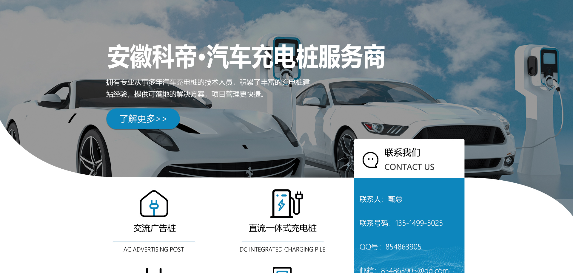 關于我們安徽科帝新能源科技有限公司坐落于安徽省會-合肥,是一家研發、生產智能充電樁設備,汽車充電站后臺監控管理系統和生產高壓開關設備的企業.由專門的研發團隊、管理團隊按照現代化企業制度規范設立的有限責任公司。致力于為能源智能、安全的應用和節能減排提供整體的技術與產品解決方案??频奂邪l、設計、生產、銷售以及服務于一體,在電動汽車充電方案,充電設施建設和城市配電方面擁有廣泛的技術研究及經驗積累,為客戶提供安全、智能的充電設備及充電運營站建設一體化解決方案。并堅持以人為本、質量為先、顧客至上、不斷創新”的企業理念,為能源行業的發展、節能減排做出重大的貢獻。公司擁有豐富的產品種類,目前科帝已研發生產了三十多種產品,充電設備有直流一體式充電樁、直流分體式充電樁、直流廣告樁、交流廣告樁、廣告一體樁、壁掛交直流樁;等多種充電設備;每一款產品都是精心打造,力求為客戶提供優越的用戶體驗。展望未來科帝將通過持續的自...
